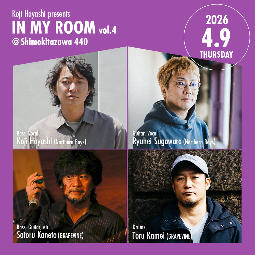 Koji Hayashi presents IN MY ROOM vol.4 SCHEDULE 2026/04/09(木) 19:30 - 下北沢440 IN MY ROOM vol.4@下北沢440 林幸治( Ba.vo)菅原龍平 (Gt.vo)金戸覚 (Ba.Gt.etc.)亀井享(Dr.) op19:00st19:30 チケットご予約はこちら URLをコピーする 報告する